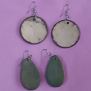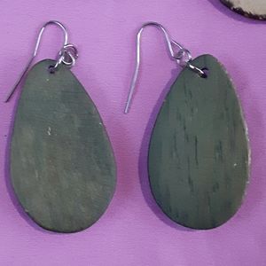 Quarter us for scale in photo an is not included. Bundle of 2 pairs of wooden earrings. Brown stained circles and green stained teardrops. Preowned costume jewelry may show signs of wear and scratches or skuffs. May have missing or misshapen parts. Bin6
