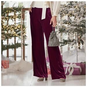 Sundance holiday collection, beautifully draping 'Festive Flair velvet pants are sure to become your party favorites. Flared legs, elastic waist, side pockets. Wine/ berry color. Rayon/silk
