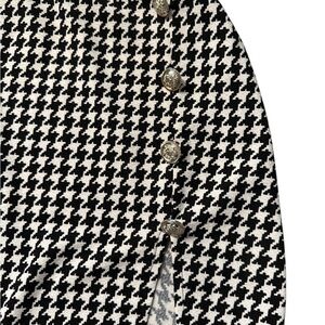 Elevate your wardrobe with this chic black and white houndstooth skirt. Perfect for any occasion, this skirt offers a timeless look with its classic pattern and stylish design.
