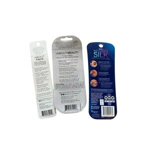 - 3 pack of About Beauty Fuzz-free fold n go groomers. smoothes away peach fuzz. maintains brows. exfoliates, folds