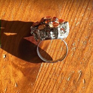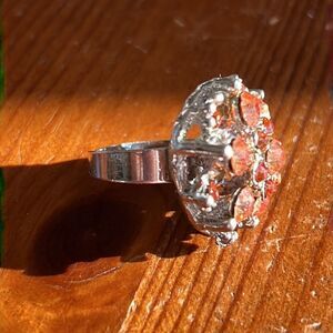 This is a lovely adjustable ring with orange embellishment. The gemstones are made of an unknown material but they do not measure as semi precious or precious stones on the Presidium Gem tester. The minimal size of this ring is a size 8 but it can be adjusted larger.