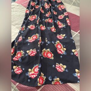 Bundle 3 for $15. Elegant black maxi skirt with vibrant floral pattern. Features red and cream flowers with green leaves. Perfect for any occasion. Size XSmall.