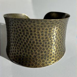 Presented here is a striking wide cuff bracelet that embodies a sense of timeless style and effortless elegance. Crafted from bronze-colored metal, the bracelet boasts a distinctive hammered appearance.