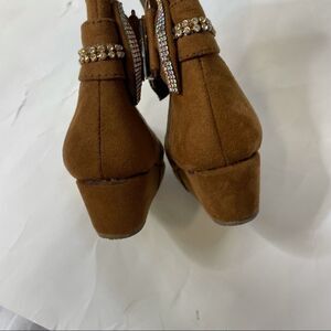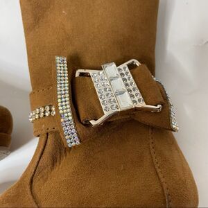 D'Monas San Francisco baby boots Faux Suede with bling bow on calf. Tan mid calf to under knee boots. Inside zip for easy on and off. See measurements in picture to ensure the correct fit. There is a small gap on the back of left heel (see pic). GUC. Winter baby boots. Super stylish.