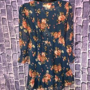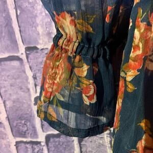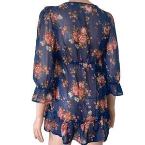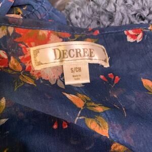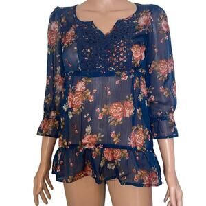 Decree brand top. Sheer navy blue with floral pattern. Baby doll style blouse. Boho top. Ruffle bottom and ruffled sleeves. 3/4 sleeves. Light and comfortable blouse. Crochet chest detailing. Size S. Flowy shirt with high waist cinching. EUC. Poolside attire, Sexy and flowy. Boho, baby doll, Crinkled top, flutter/balloon sleeves. 70s-inspired. This look is fashionable and trending.