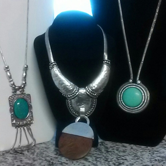 @marlow1 The longest of the three is the square turquoise necklace. It hangs at about 12 to 14 inches depending on neck size.