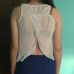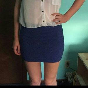 Flowery blue lace pencil skirt and light sheer top with gold heart buttons. Very good condition.