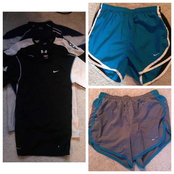 Two pairs of Nike shorts with three Under Armour Boys Compression Shirts! Shorts: XS and Shirts: S, M, XL