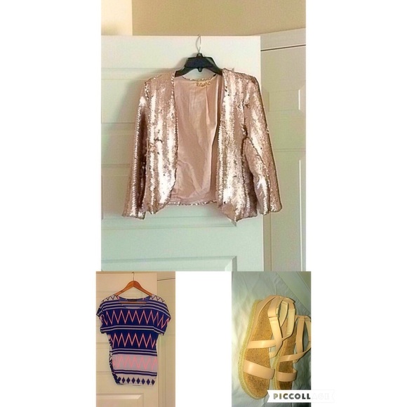 Baby Phat Sequin Cardigan. Adrienne Vittadini Sandals (nude/pink) Size 8.5. & cute blouse.