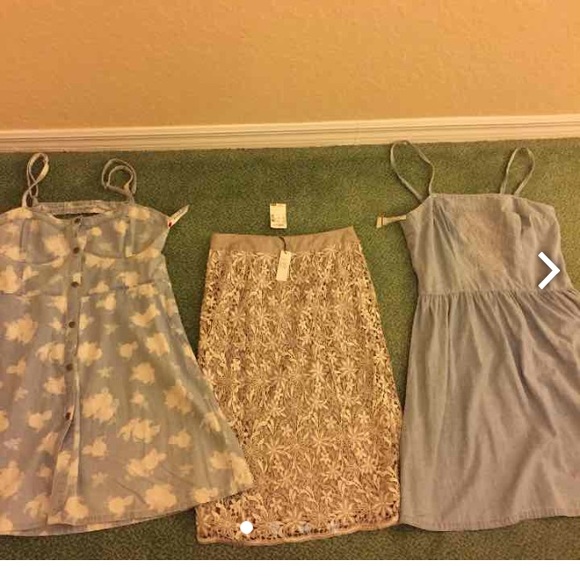 I would like to sell everything as a bundle to cotton denim dresses one great skirt the first three items are brand-new with tickets never worn and the black and purple cocktail dresses the purple one I have not worn but there is no tickets and just needs maybe a little dry cleaning from sitting in the closet the black one has been worn it is a size 4 one shoulder