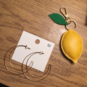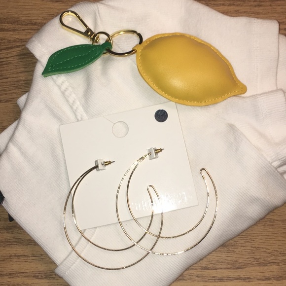 Selling a white tee ☁️ moon earrings 🌛 and a fun little lemon keychain! 🍋 The shirt is a medium and from Target, the earrings are from Forever 21, and the keychain is from SHEIN! All are brand new and have never been used/worn before :)