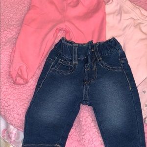 Two pair of footed leggings a pair of jeans and pair on leggins with tutu