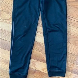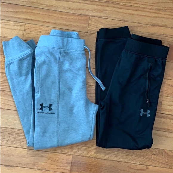 2 pairs of under armor joggers, size S, both have wear and tear. Grey paints have grass stains on knees and tiny red stain on back, black pants have a tiny white paint stain on knee.