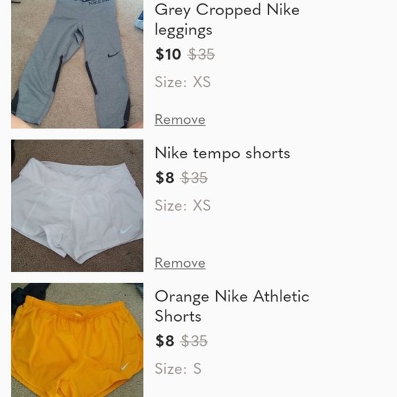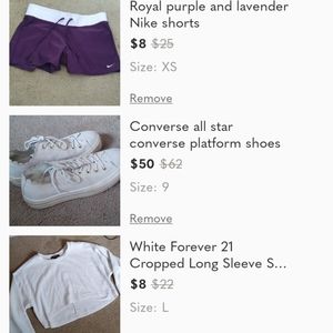 Grey cropped Nike leggings, white nike tempo shorts, orange Nike tempo shorts, Nike dri-fit crop leggings, blue nike power 6" inseam spandex, nike fleece quarter zip, royal purple and lavender Nike shorts, converse all star platform shoes, white forever 21 cropped long sleeve, light blue and white sports bra, light purple strappy sports bra, short sleeve light blue forever 21 crop top