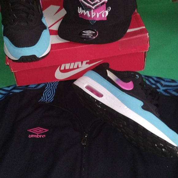Nike jewel swoosh airmax one ..Umbro hat and Jacket all south beach color way