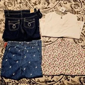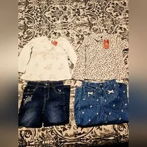 New with tags two sets one shirt white has pink flowers throughout pants have flowers throughout the other white with pink butterflies throughout pants have pink shooting star and small stars 4 T