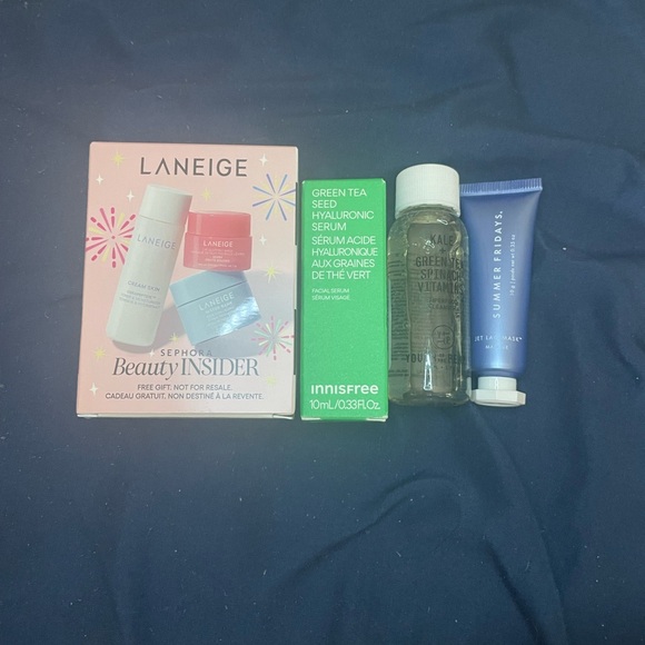 Laneige cream skin .84 lip mask .10 and water bank .33, innisfree green tea serum .33, youth to the people cleanser 1, summer Fridays jet lag mask .35. NWT