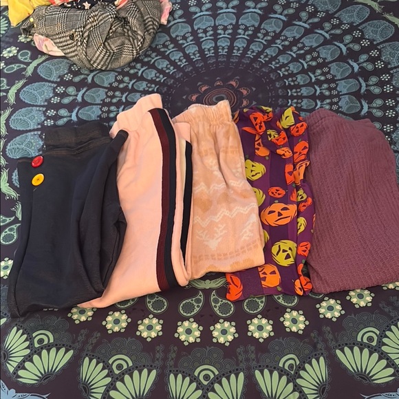 Bundle of girls bottoms soft denim pull on bottoms pink sweat pants pink pj bottoms Halloween leggings purple ribbed bottoms