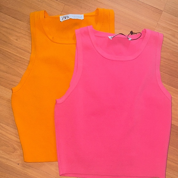 Bold sleeveless tops in bright orange and pink. Ideal for a vibrant style. Pink is brand new