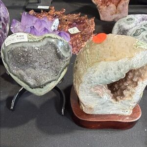 Beautiful heart-shaped geode with sparkling crystals. Comes with a sturdy stand.