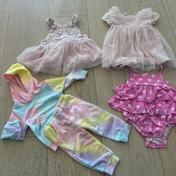 Stella McCartney Kids coordinating set. Includes pastel rainbow hooded top and pants. Features light pink tulle dresses with sparkle. Pink ruffled romper with white print. Soft, colorful fabrics. Cute and playful styling.