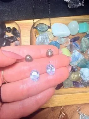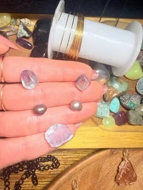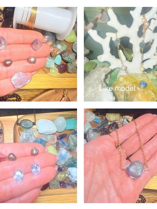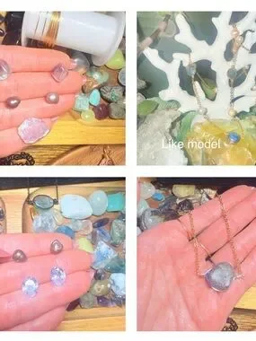 Pearl necklace with lepidolite in center fluorite on the sides and pearls in between just like model. 24 inches on necklace with 3 inch extender. Gold