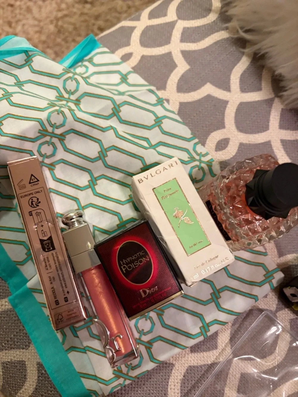 Bulgari boxed fragrance in mint green packaging. Accompanied by a glossy pink lip gloss with pearl shimmer. Includes decorative tissue with turquoise trim. Chic, feminine duo for gifting or travel.