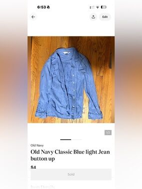 Old Navy long-sleeve button-up shirt. Light blue denim-style fabric with front buttons. Classic collar and simple silhouette. Easy pairing for casual outfits.