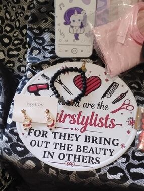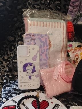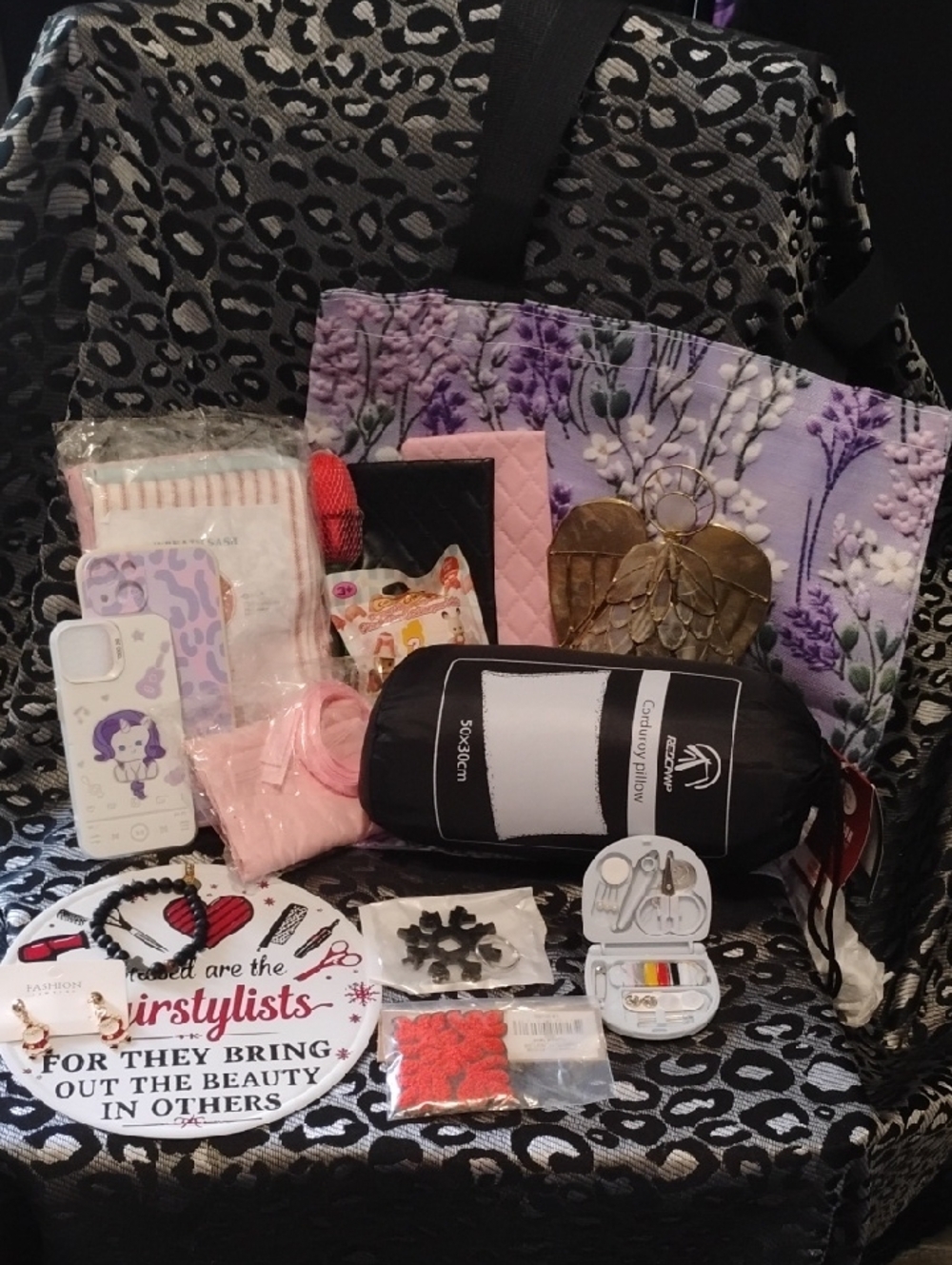 2 phone case, 1 wealth sash four piece set, 1 makeup brush, 2 eyeglasses case, 1 Christmas tree angel with light, 1 red camp corduroy pillow 50x30 cm, 1 banner, 1 sewing kit, 1 keychain, 1 iron on patch, 1 bracelet, 1 Santa Claus earrings, and 1 mystery plush