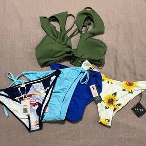 Includes floral and patterned bottoms. Ideal for summer vibes. Tie sides olive top. Blue bottoms ALL are brand new with paper guards and tags