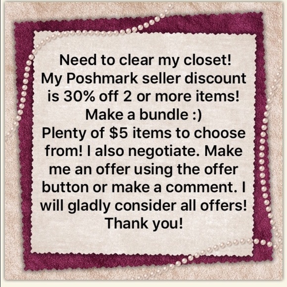 My Poshmark discount is 30% off 2 or more items! Check out my closet! Plenty of $5 items. See something you like but don't like the price? Make me an offer using the offer button or make a comment :) Thank you for showing my closet some love! ๐๐๐ ๐๐๐๐ฝ