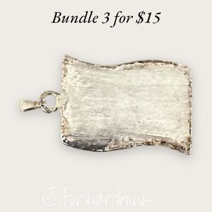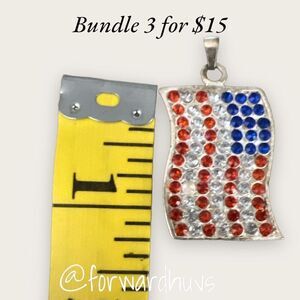 This is a listing for a United States, rhinestone embellished, silver tone flag pendant, which is in good used condition. This does not come with a chain and has some normal wear from normal use. This has no stains or significant damage and has been loved by its previous owner.