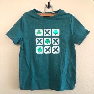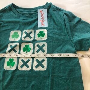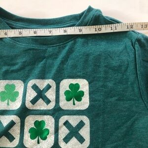 features a green color with a graphic print of a TicTacToe game and a Shamrock character