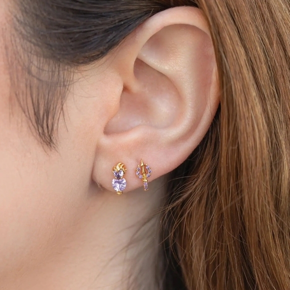 Enhance your style with these chic gold and purple earrings. Perfect for adding a touch of sophistication to any outfit.
