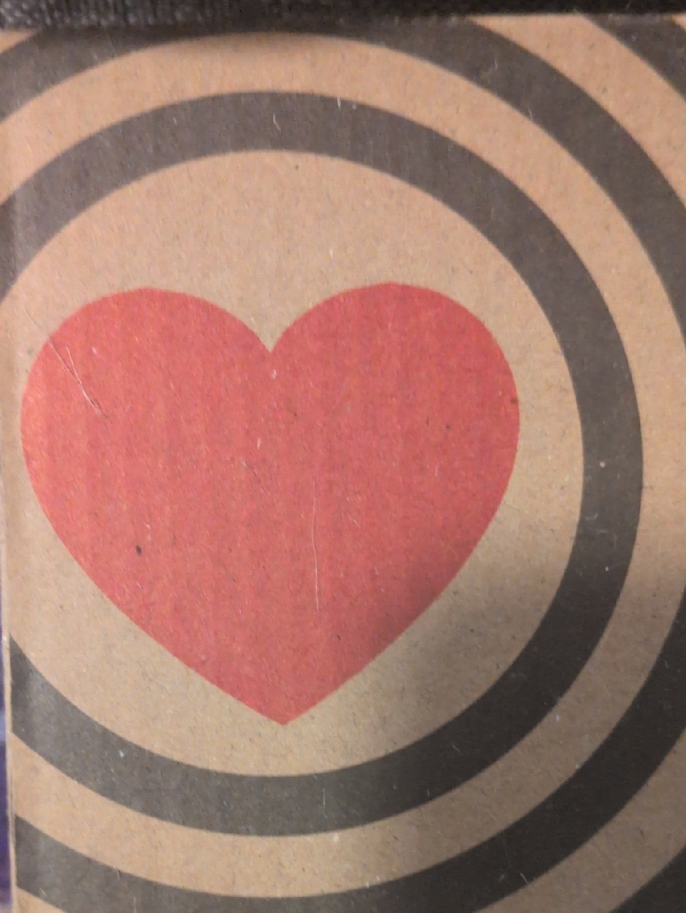 Bold red heart print on kraft cardboard. Black concentric circles frame the heart. Simple, graphic design.