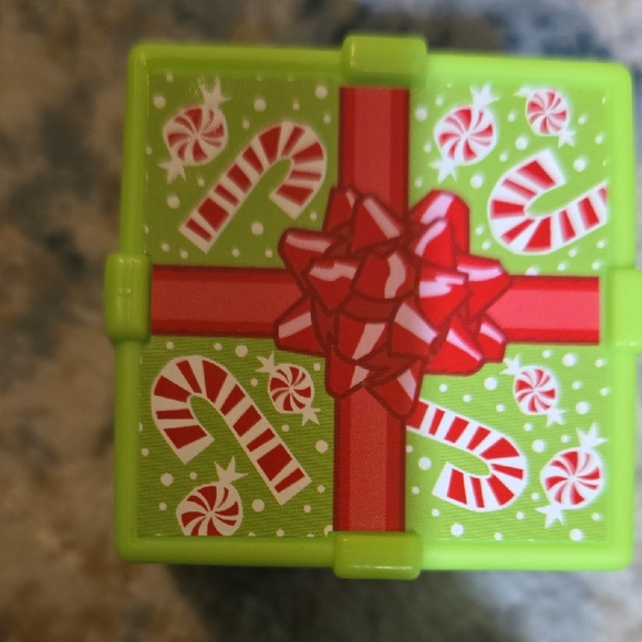 Bright green gift box with a red bow and candy cane design. Perfect for holiday decor.