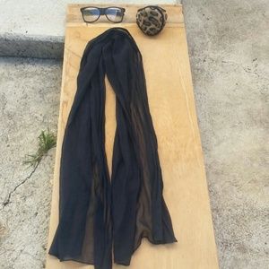 A bundle of H&M cheetah print sunglasses, Blue scarf, and Degrees cheetah print earmuffs. Used, but All in good condition. Scarf come with no tags. Scarf is 100% rayon. Earmuffs cotton with black polyester lining.