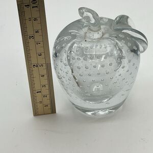 Vintage hand-blown clear art glass apple paperweight features controlled bubbles. Apple is suspended within Apple with Bubbles