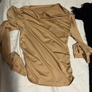 Brown Off-Shoulder Ruched Top (Size S, NWOT) – An off-the-shoulder neckline with a fold-over detail, this pullover long sleeve top is great for any occasion. Brand new without tags (NWOT).