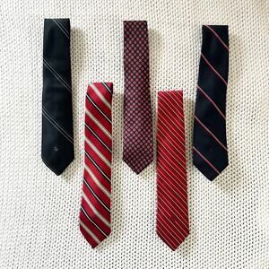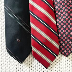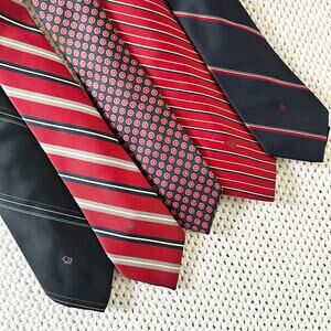 Bundle lot set of 5 designer men's ties. Preowned in excellent condition with light signs of wear throughout. Bundle lot includes 3 Christian Dior ties, Roots, and Etienne Aigner. Ties are a slimmer more modern cut in classic designs. Includes