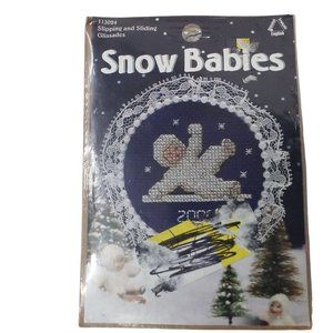 Item 1 = Leisure Arts Cross Stitch Kit style: 113024 Snow Babies Slipping & Sliding Glissades Ornament made USA, finished project 2x4 embellished picture of snow baby, sealed/complete with instructions pattern graph 14 ct printed canvas fabric needle floss/yarn supplies, in shades of multicolors.