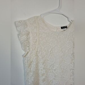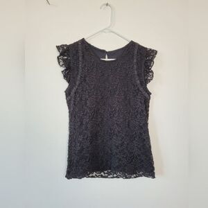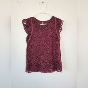 Lot of Three sleeveless lace blouses, black, maroon and white. Fully lined with Ruffle Flounce sleeves and button Keyhole in back. Good condition. Some minor signs of wear. Overall good. Size small. measures approximately 24 inches long 17 inches underarm to underarm laid flat.