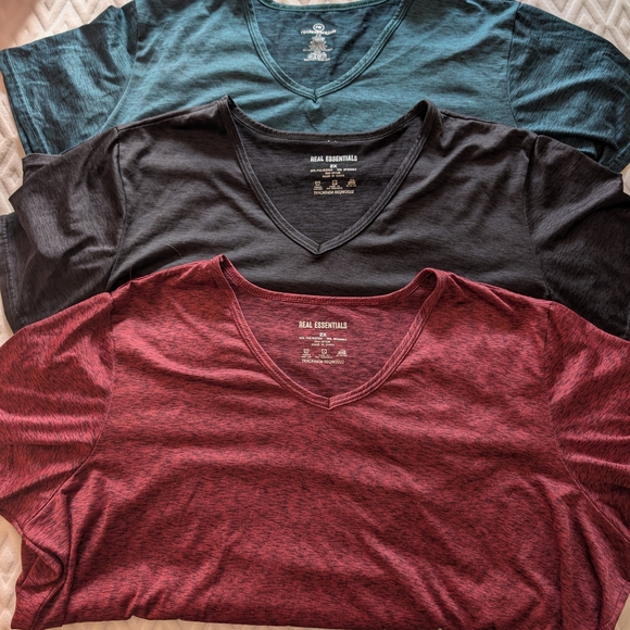 Experience comfort and style with Real Essentials Women's V-Neck Short Sleeve Tees. Available in teal, black, and red, these tees are perfect for everyday wear. In great shape and from a smoke free home