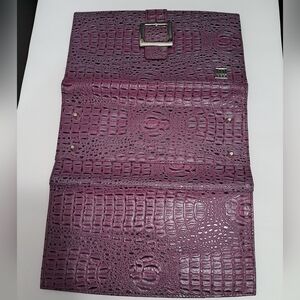 1. Purple crocodile faux leather, silver buckle & logo, black tri fold lining, four silver studded feet