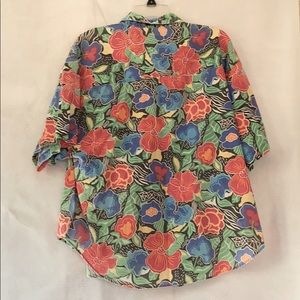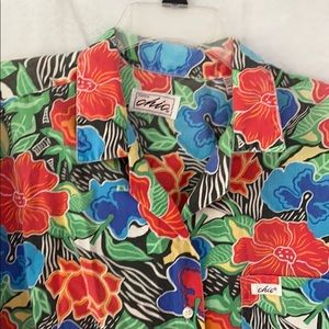2 shirts bundled together. Tropical multi color Floral shirt by Chic. Frantic blue & black plaid shirt no size or care tag. Approximate flat lay measurements: Both blouses pit to pit 25” Length center back base of collar to hem floral shirt 27” plaid shirt 28”. Floral missing very top button. Both rounded hems, one breast pocket each. Casual plus size women's shirt blouse top plaid floral colorful tropical