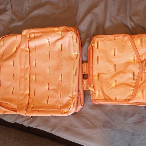 Stylish orange backpack with a unique pattern. Perfect for daily use.