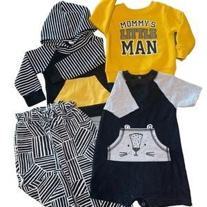 🪩 Style: A lovely selection of 12 Month old clothing bundle. 4 piece set. Color palette of black white and Mustard Yellow.
