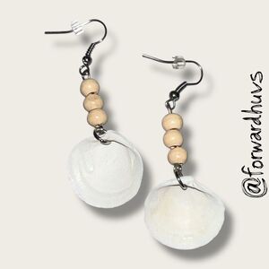 Boho Shell Earrings in a 2.25 inch fishhook wire style featuring natural white seashell drops paired with three light-toned wooden beads. These earrings are crafted in a beachy, bohemian theme and hang from silver-tone fishhook ear wires with soft silicone backs for added comfort. Preowned; excellent condition with no visible wear or damage.