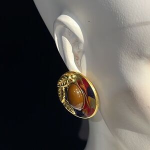 This is a beautiful pair of vintage style (80s) earrings with multi-colored swirling enamel over the gold body. These are quite lovely with a wreath like pattern of leaves on 1/4 of the earrings.