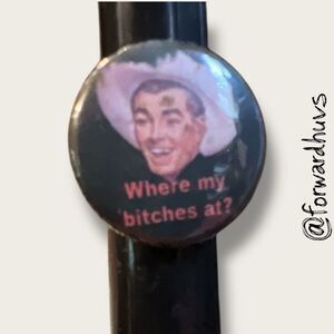 This hand-assembled novelty ring features a vintage-style button top with a bold pink caption: “Where My Bi*ches At?” beneath a smiling cowboy in a white hat and black shirt.